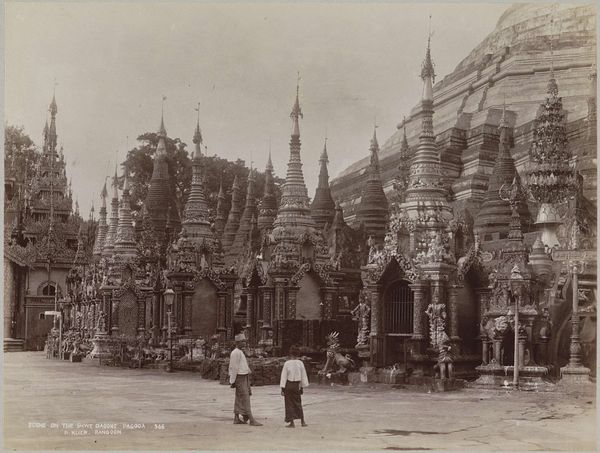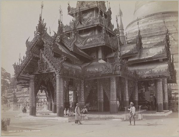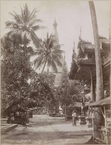 Curator: This is a photograph titled "Ingang van de Shwedagon pagode, Rangoon" attributed to P. Klier, and its dating is estimated between 1895 and 1915. The image captures the entrance of the Shwedagon Pagoda in Rangoon. Editor: My immediate impression is one of meticulous craftsmanship and serenity. The intricate detailing of the pagoda’s architecture, set against the open space, creates a contemplative atmosphere. Curator: Indeed. Looking closely, the photographic process itself is fascinating. Consider the material reality: glass plate negatives, the specific chemical emulsions of the time. Each element in this image’s creation required specialized labor and techniques. And of course, the infrastructure for both artistic creation and mass consumption. Editor: Absolutely, and we must consider the historical and political dimensions too. This pagoda serves as more than just a picturesque subject. Its construction involved hierarchies of labor that continue to shape identity and lived experiences in Myanmar, including but not limited to, the colonial presence and power dynamics implicit in the photographer’s gaze. Curator: How so? I see the work, but colonial structures are less immediately available. Editor: By depicting this sacred space for a presumably Western audience, Klier’s photography subtly reinforced the colonial narrative. It is both documentation and a form of appropriation. Who held the power to represent whom, and how? The answer echoes beyond this simple photo. It resonates deeply. Curator: I think we are well advised to recall how the development of photographic technology in general coincides with colonialism, allowing images and understandings to move freely between colonized countries. What are the ethics of visual documentation during periods of colonial oppression? Editor: Precisely. We need to view this photograph not just as an artistic piece, but as a historical artifact, embedded with social, cultural, and political implications. Considering, as well, the way Buddhist identity is formed with reference to it, too. Curator: I appreciate that critical framing. Considering this, I walk away feeling like I now possess a deeper awareness of how photography intersects with labor, social, cultural, and colonial power. Editor: Me too. Now, with increased sensitivity, I am reminded that this work holds multiple histories in plain sight.