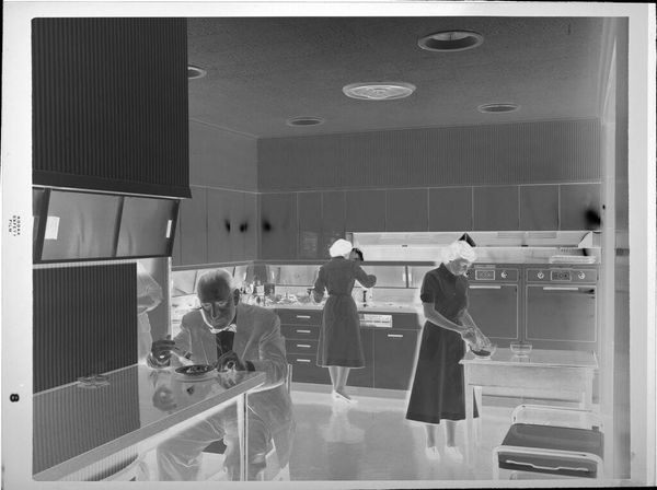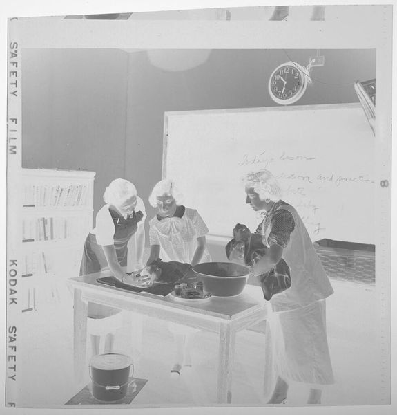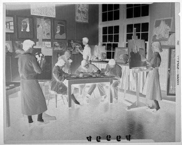 Curator: This photograph by John Deusing presents an interior view of a children's clothing store. Editor: There's a starkness to it, almost clinical, despite the patterned wallpaper. The inverted tones create a ghostly effect. Curator: Precisely, the reversal amplifies the visibility of class and labor implicit in the garments themselves and within the commercial space. Consider the labor and raw materials woven into each item. Editor: The lighting is crucial, isn't it? Those pendant lamps draw attention to the displays, highlighting the sheer volume of merchandise available for consumption. What does it say about the labor and accessibility in the area? Curator: It speaks to the complex matrix of gendered expectations and socioeconomic status projected onto children through clothing. Deusing invites us to consider the hidden narratives woven into each piece. Editor: I appreciate how it makes me question my own assumptions about consumption and production of everyday items.