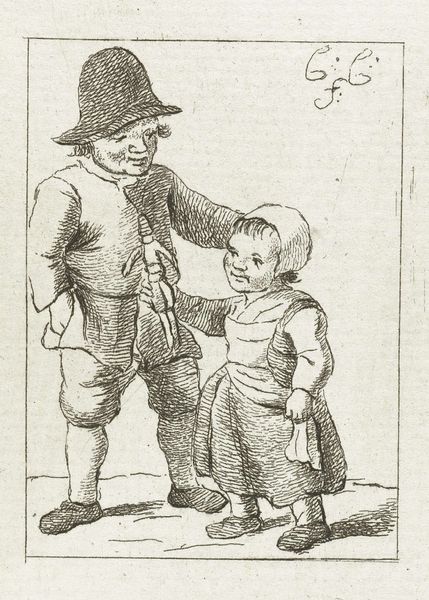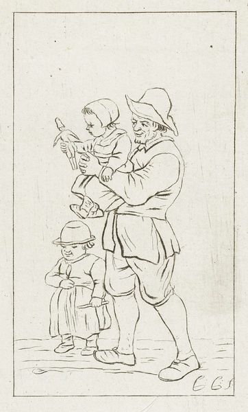 Curator: Oh, I adore this drawing! "Father with Two Children," a pen and ink sketch made between 1777 and 1779, is attributed to Pieter de Mare. It's currently held here at the Rijksmuseum. Editor: There’s a tenderness, a raw affection sketched into those lines. I like the father’s gait. It's slightly awkward, isn’t it? He's walking, trying to manage two kids...it’s a very real moment. Curator: It certainly captures a quotidian scene. Genre painting was quite popular at this time and often touched on the themes of domesticity and the nuclear family in a quickly-urbanizing Holland. Look at how the children are individualized. Editor: The baby in his arms is clearly fascinated with whatever it's holding, that sort of wonky homemade toy. It feels almost voyeuristic, peeking into a quiet afternoon. Curator: The artist uses line weight so well here. Thick strokes to define the father's robust form, much lighter for the delicate features of the children. It adds to this sense of both groundedness and ephemeral beauty. Editor: I think, perhaps, there's a wistful quality, maybe even tinged with a bit of melancholy? The father seems preoccupied, almost burdened, but undeniably loving. Or am I just projecting *my* anxieties about parenthood here? Curator: Well, the late 18th century was also a time of massive social upheaval. Perhaps De Mare intended for a socio-political commentary? The contrast between idealized domestic life and the looming pressures of war could easily play a role in a piece of this nature. Editor: It just proves art often gives us more questions than answers, doesn't it? For me, it’s less about political commentary and more about the fleeting beauty of everyday moments. Life keeps walking onward, even while the kids keep on keeping us occupied. Curator: I agree. Even though the Romantics valued emotional expression above most things, they often saw it in connection with specific cultural and political anxieties. Perhaps De Mare wished for a synthesis between family, faith and Fatherland, but only wanted to depict it via a commonplace interaction, which really broadens this work's appeal, don't you think? Editor: Absolutely. I started off seeing a simple domestic sketch and am walking away with more than I bargained for. Thanks for painting a richer story!