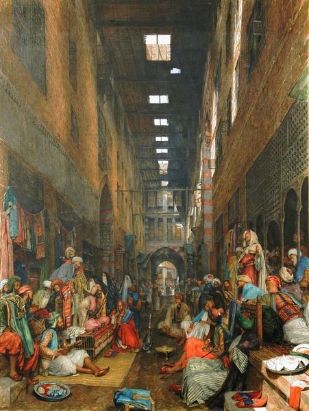 Nasreddine Dinet’s painting, A Village, captures a procession of women in a North African village, rendered with a striking interplay of light and shadow. The composition is structured around the stark contrast between the brightly lit doorway and the shadowy foreground where the figures are gathered. This juxtaposition draws our eye through a semiotic contrast, the bright door signaling an exit point into a new space or plane. The draped figures, faceless and almost spectral, are differentiated by color—whites, pinks, and deep blues—but uniformly shaped as they ascend the steps. This repetition creates a sense of rhythm and suggests an underlying social structure, and is also a symbol of the collective identity of the village community. Consider how Dinet uses the materiality of the paint itself, with textured brushstrokes that define the rough surfaces of the buildings and the fluid drapery of the garments. These formal qualities invite us to consider how the artwork functions as a cultural artifact and visual document, reflecting both an aesthetic vision and broader narratives about identity, space, and representation.