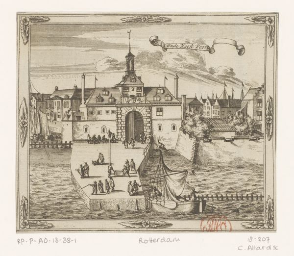 Editor: We are looking at “Gezicht op de Ooster Nieuwe Hoofdpoort,” an etching and engraving print made around 1696-1730. The details are incredible, despite the small scale and monochrome palette. What formal qualities strike you? Curator: Immediately the linear structure commands attention. Harrewijn uses precise lines to define every element. Note how the architecture is rendered: crisp edges define each brick and tile. Do you observe a spatial hierarchy at work? Editor: Yes! The gate occupies the central ground, the water recedes into depth on either side, and the larger building anchors the background, so our eye is drawn around in a sort of circle, from foreground to middle to background. What does that signify, the order in the structure? Curator: Precisely. It directs the eye strategically, emphasizing depth and perspective through calculated placement. And what of the interplay between the solid structures and the fluidity of the water? Consider also the stark contrast between light and shadow, modulating the planar surfaces of the gate. This serves not simply to mimic reality but to intensify the visual drama. Editor: The way you focus on line and placement makes the piece feel so carefully planned. Looking at the distribution of darks and lights has reshaped my experience completely! Thank you. Curator: And understanding the framework through which art is built allows deeper connection, beyond the surface narrative.
