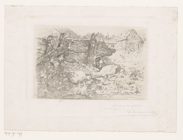 Editor: Here we have Delacroix's "Tiger Resting in the Desert," made in 1846. It’s an etching on paper, and I find its small size kind of intimate, like a captured moment. What strikes you most about this piece? Curator: I’m drawn to the labor involved in etching, a printmaking technique where the artist uses acid to cut into a metal plate. Consider the physical effort and the toxic materials Delacroix handled. It highlights a specific kind of artistic production of the time. How might this connect to Romanticism? Editor: Well, Romanticism often focuses on intense emotion and the power of nature. Maybe the grueling process reflects that intense artistic drive or even mimics the harshness of the natural world the tiger inhabits? Curator: Interesting. And where do the materials come from? The paper, the metal, the acids – these are all products of labor, extracted from the earth, manufactured and sold. Do you see this work as just representing a tiger or also revealing the structures that enabled its creation? Editor: I see what you mean! The "exotic" tiger is right there, but there’s a whole supply chain we’re not immediately considering. So, how does considering the process change how we interpret Delacroix’s intent? Curator: Perhaps it complicates it. Instead of solely focusing on the artist's individual genius, we examine the broader social and economic forces at play. It shifts our understanding away from purely aesthetic appreciation. Editor: I’m definitely seeing that. Looking at the materials and the means of production gives you a completely different understanding, almost political. Curator: Exactly! We started with Romanticism but found something more grounded in the material world.