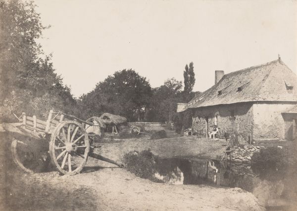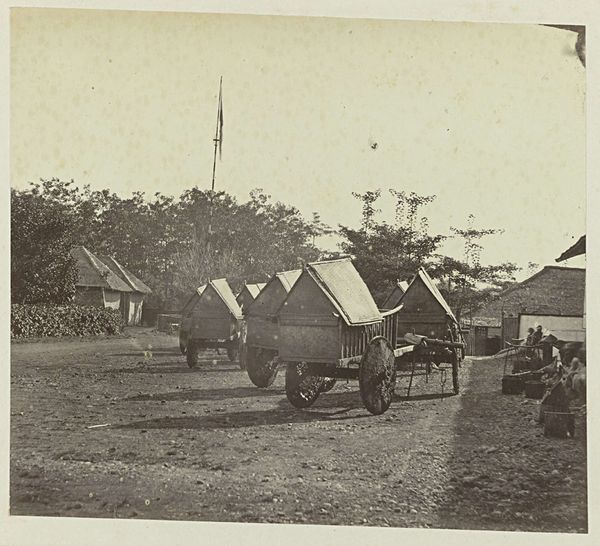 Curator: Here we have an albumen print by Willoughby Wallace Hooper, dating from the late 19th century, titled "Native Encamping." Editor: It’s remarkably still. You almost feel like you shouldn’t breathe too loud. Like you’d disturb the scene. Curator: The composition certainly directs our gaze. Note how the linear arrangement of animals and carts leads toward the central figure, creating a defined focal point. Editor: I see a life of transit and migration, where humans and animals are bound together in one rhythm. I wonder where they are going, and if they have a home. Curator: Hooper’s technical mastery of light and shadow enhances the photograph's depth and texture, enriching its narrative potential. Editor: Maybe it's the stillness that makes you wonder about their story. Curator: A very insightful observation, considering the photographic form. Editor: Well, that makes my wandering worthwhile.