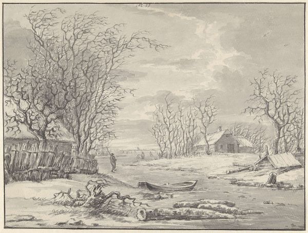 Curator: Before us we have "Winter Landscape with a Village View" by Matthieu van Plattenberg. It's difficult to nail down an exact date, but it was created sometime between 1617 and 1660, falling squarely into the Dutch Golden Age. The artist worked primarily with printmaking techniques; this is an etching, with some engraving as well. Editor: It’s a chilly scene. I can practically feel the damp air radiating from that water and see the shivers of folks moving about. What’s most impressive is how much detail he wrings out of a rather limited palette using engraving—you can really get into the tactile sense of that labor. Curator: Precisely! Plattenberg was part of a larger movement popularizing genre scenes and landscapes. His works offered glimpses into everyday life. They found a ready audience eager to see the mundane elevated into the realm of art. The burgeoning middle class also enjoyed identifying themselves and their villages within these images. Editor: The depiction of labor and ordinary tasks is critical to the work’s success. We observe figures seemingly weighed down not only by their loads, but also perhaps by the burden of winter itself. It speaks volumes about the daily lives of ordinary folks and what they made. It makes me consider the role of artistic creation. Curator: Good point! This was also the age of expanding print culture. These types of images circulated widely, helping shape ideas of Dutch identity and showcasing the prosperity and perceived normalcy of the Republic despite constant political and military tensions. Editor: Did the ready availability of prints contribute to the accessibility of this new national image? Because in addition to the labor we are looking at in the foreground of the composition, there’s also the labor required to reproduce it. Curator: Absolutely. The very process of creating and disseminating such images was becoming increasingly industrialized and contributing to this self-awareness, if that makes sense. Editor: Very much so. Considering Plattenberg’s deft hand in etching, what may initially appear to be merely a depiction of landscape becomes so much richer once we consider it from the view of a new, industrious viewership. Curator: This has broadened my perspective; the role of prints in crafting a shared cultural consciousness during the Dutch Golden Age, the way an artist mediates and frames national identity… it is significant. Editor: Right, and I now see a new angle on Plattenberg's skill through our discussion of material conditions, reminding us of the ingenuity behind art accessible to more than just the wealthy few.