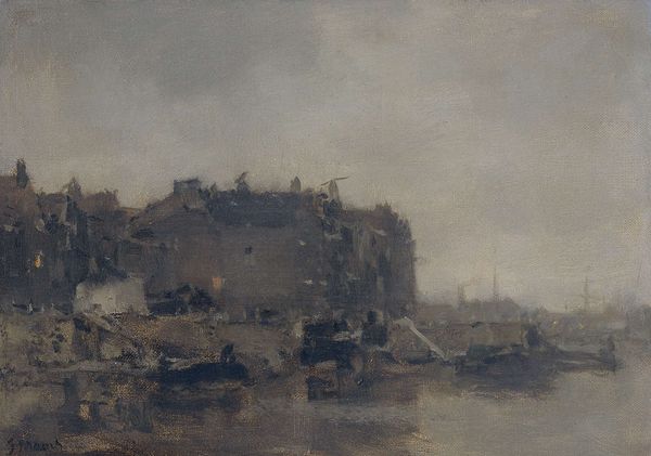Editor: This oil painting, simply titled "Landscape" by Charles-Francois Daubigny, dating sometime between 1840 and 1878, evokes such a tranquil, almost melancholy feeling with its muted tones. The presence of the windmill and distant buildings lends a subtle human touch, while the vast open field creates a sense of quiet solitude. What symbols do you see here, Curator? Curator: I'm immediately drawn to the windmill, and that distant town. Windmills, across cultures, have often represented industry, perseverance, and even the human ambition to harness natural forces. What could that say, placed against this vast land? Editor: It's a small mark on a wide horizon. You also mentioned the distant town... Curator: Yes, the buildings clustered far away suggest community, stability. Do you see how they contrast against the wild, untamed nature of the foreground? It invites a contemplation on the relationship between civilization and nature, wouldn't you say? And it seems to ask: does humankind impose upon the landscape or complete it? Editor: I see that now! So the artist uses these juxtaposed symbols to present a tension between our built world and the natural one. It's fascinating to see how Daubigny conveys such complex ideas through such a seemingly simple landscape. I was mostly drawn to its simple, evocative quality at first glance. Curator: Indeed. The painting presents familiar visual archetypes with potent cultural and psychological resonance. I am keen on the journey an image takes across generations. I wonder how this will resonate 100 years from now. Editor: I hadn't thought of that. This piece now has far more depth. Thank you for helping me uncover its symbolic significance!