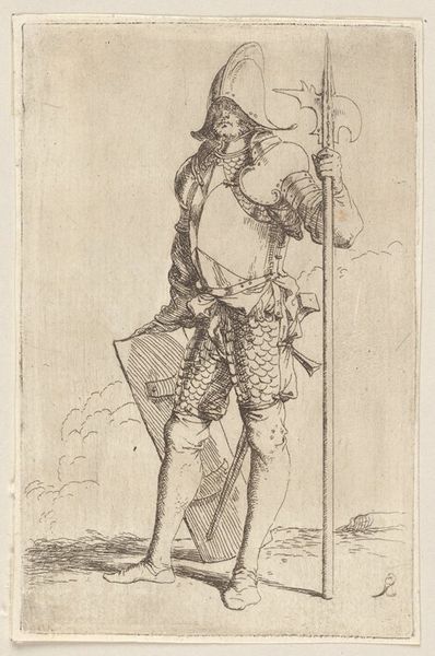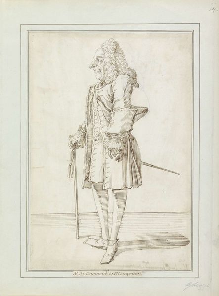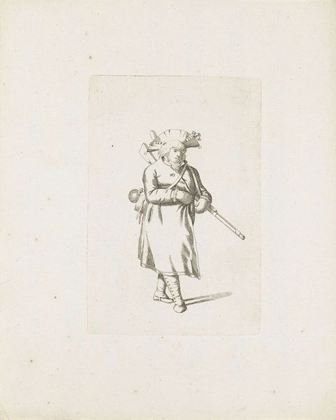 Curator: Let’s turn our attention to “Staande Franse soldaat,” or "Standing French Soldier", a drawing created around 1795 by August Christian Hauck, currently residing here at the Rijksmuseum. Editor: It’s so delicate, almost ethereal. I’m immediately drawn to the light touch of the pen and graphite. It feels very immediate, like a fleeting observation. Curator: Absolutely. This work emerges from the Neoclassical art movement, situating it in a period grappling with revolution, the shifting socio-political landscapes, and the rise of new forms of identity. What does this solitary soldier communicate within the framework of broader historical contexts? Editor: Well, looking at the hatching and cross-hatching, especially in rendering his uniform, you can see a dedication to material accuracy, the texture of the fabric, the cut of the coat. Hauck clearly knew his subject, understanding both its construction and its role in constructing the soldier’s identity. Curator: Yes, consider the very act of depiction. Soldiers, particularly French soldiers, become symbolic during the period after the French Revolution. The image embodies shifting class structures, questioning the aristocratic structure through a romantic idealization of the "common man.” The figure, even with his firearm, lacks overt aggression, conveying an introspection which might reflect internal challenges the newly formed republic was facing. Editor: I agree, but the image can also reflect the material circumstances of military life. You see the way the soldier carries his musket. It speaks to repetitive actions, the weight of duty, of how labor literally shapes a body. It makes me think about the military-industrial complex and the endless production of warfare objects. Curator: Precisely. By analyzing this representation through multiple lenses of production and reception, we confront dominant narratives that sanitize conflicts. What sociopolitical message emerges when viewing an individual amidst the industrial and political implications of war? Editor: Seeing it this way shifts my perception from a historical portrait to one of raw labor. Curator: Which underscores how interrogating historical images gives voice to suppressed narratives, revealing nuances of socio-political identity. Editor: It is a powerful illustration about how materiality, far from being a neutral element, is charged with social and political meaning.