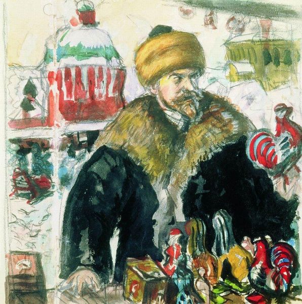 Boris Kustodiev painted this work, Merchant, with oil. Kustodiev isn't trying to blend everything together; instead, the textures and colors stay distinct, each dab of paint visible, reminding us of the handmade quality of the art. The brushstrokes are confident but not fussy, giving the whole piece a lively feel. Look at the merchant's beard—it's not just a beard, it’s a flurry of white strokes, each one catching the light differently, almost like he’s made of soft snow. The way the paint handles light and shadow makes the scene jump to life, which makes you think about the person’s life, what they were like, how they lived. You can see echoes of artists like Chaim Soutine in Kustodiev's approach, but with a Russian twist. It's like they're all talking to each other across time, sharing ideas about how to capture the messy, beautiful stuff of life in paint.