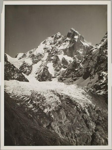 Editor: This photograph by Vittorio Sella captures Koshtautau from the Lower Left Side of Ulluaus Glacier. The stark contrast between light and shadow gives it such a dramatic feel! What do you see in its composition? Curator: The image commands attention through its meticulous arrangement of tonal values. Observe how Sella crafts depth using stark contrasts, the interplay of light and shadow defining the mountain's form. Editor: So, it's less about the subject matter itself, and more about how he presents it? Curator: Precisely. Consider the textures; the sharp, jagged peaks against the smooth, flowing glacier. Sella uses these elements to create a visual rhythm, a dialogue between the static and the dynamic. Editor: That's a perspective I hadn't considered before. Thanks for pointing out the formal qualities. Curator: Indeed. It is through this rigorous visual analysis that we may understand the artistry inherent in Sella's work.
