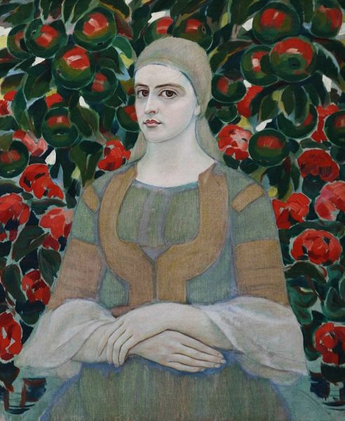 Curator: Mark Gertler, born in 1891, painted this work, "Portrait of a Girl." It now resides in the Tate Collections. Editor: The painting evokes a sense of quiet introspection; her gaze is averted, almost melancholic, and the palette feels muted, except for the bright beads. Curator: Gertler's position in the London art scene placed him amongst post-impressionist explorations, and this portrait reflects those modernist interests in form. How might we read the sitter’s identity through these stylistic choices? Editor: Perhaps through a lens that acknowledges the constraints placed on women, especially artists' models, at the time. Her downcast gaze and the flatness of the composition seem to speak to the limitations of her agency. Curator: Considering the gallery context, I see a painting that has become part of a canon, shaping the way subsequent generations understand early twentieth-century portraiture. Editor: Yes, and understanding how those canons evolve and the biases they perpetuate is why revisiting works like this remains crucial. Curator: Indeed, this portrait reminds us of the ongoing dialogue between art, identity, and historical interpretation. Editor: Absolutely, a dialogue that challenges us to question what we see and the stories we tell.