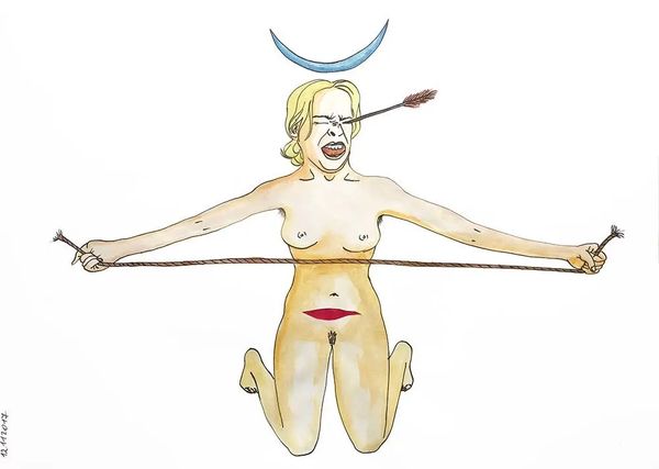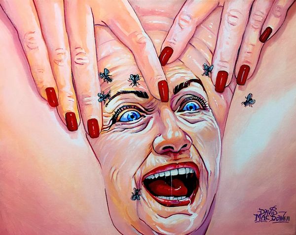 Dave Macdowell’s “Orange Crush,” a painting from the 20th century, confronts us with an unsettling composition. At first glance, the faces of two prominent political figures, contorted in extreme expressions, dominate our visual field. These faces are interwoven with the imagery of the American flag, immediately evoking themes of national identity and political tension. The artist's approach to form and structure is particularly striking. Macdowell uses a hyper-realistic style, exaggerating the features of the figures. This distortion destabilizes the conventional representation of political leaders. The flag acts as a backdrop, but it is also implicated in the emotional turmoil conveyed by the subjects. The colour palette further amplifies the sense of unease. The reds and blues of the flag clash with the fleshy tones of the faces, creating a visual discord that mirrors the political divide the artwork seems to critique. Ultimately, “Orange Crush” is a provocative piece that uses formal elements to challenge fixed meanings and engage with new ways of thinking about power and representation in contemporary society. It is a reminder that art can be a powerful tool for questioning established norms and values.