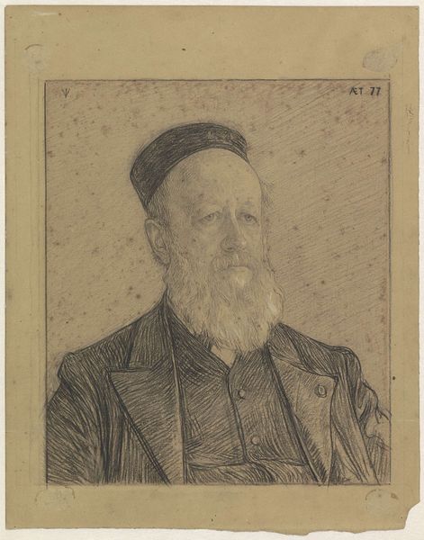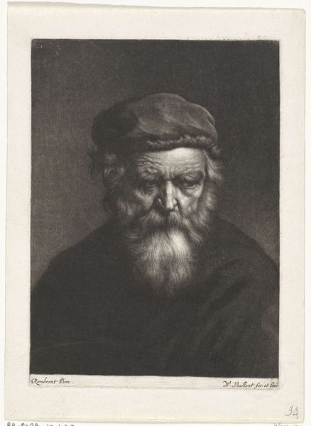 Dirk van der Toorn created this study of an old man with a beard in monochrome. The composition focuses predominantly on the sitter’s head and shoulders. Observe how the figure's gaze and posture are oriented to the right, a compositional choice which encourages the viewer's eye to follow this line of sight. Consider the relationship between the textured rendering of the beard and the smoother handling of the face. The artist may have sought to explore contrasts between the material roughness of age, versus a more idealized representation of the human form. The formal elements here may subtly undermine traditional notions of portraiture. By drawing attention to the study of the head, van der Toorn invites reflection on the conventions and cultural codes embedded within artistic representation. This is a work that seems to question rather than affirm.