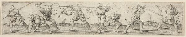 Editor: This is Wendel Dietterlin the Younger's "Procession of Monstrous Figures," made around 1615. It's an engraving. It definitely has this satirical, almost darkly comical feel to it. What do you see in this piece? Curator: It’s fascinating, isn’t it? Consider the period: early 17th century, Europe still grappling with the aftermath of the Reformation, simmering religious and political tensions. This “procession” isn't just whimsical; it’s a potential commentary on power, authority, and social order. Editor: So you’re thinking these grotesque figures are stand-ins for actual figures in society? Like, a caricature of the elite? Curator: Precisely! Dietterlin, in employing caricature, offers a subversive critique. Who benefits from perpetuating monstrosity in the social order? Consider, too, that early modern art was often deeply invested in ideals of beauty and harmony. What does it signify when an artist so deliberately rejects these ideals? Editor: It’s like he's saying the system itself is monstrous. Are there other artists at this time that use this type of imagery? Curator: Definitely. Think of Bosch or Bruegel, for instance, artists who similarly used grotesque figures to critique society and human folly. Also consider the role of costume and carnival in social satire during this period. Does this inform how we should think of the figures Dietterlin constructs? Editor: I see what you mean; thinking about the costumes and almost performative nature of the procession offers new layers of interpretation about social and gender norms being questioned at that time. Thanks! Curator: It’s been a thought-provoking exchange. Hopefully we can continue this conversation next time!
