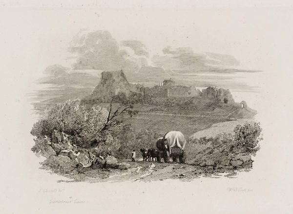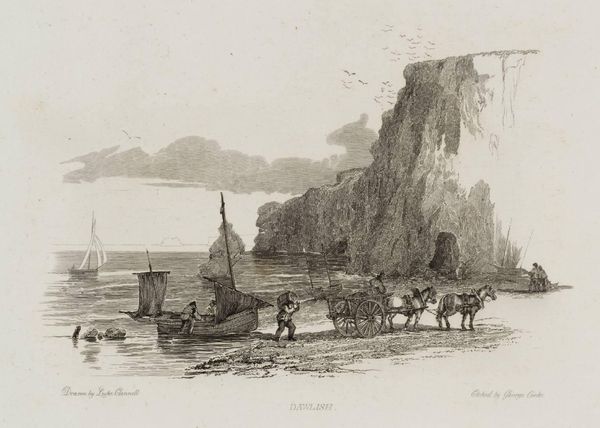 Curator: Samuel Owen's "Land’s End Cornwall, with Long-Ship’s Light-House" gives us a glimpse into a rugged coastal scene. Editor: Yes, it immediately strikes me as both bleak and romantic. The heavy clouds above mirror the jagged cliffs below. Curator: The engraving beautifully captures the textures of the Cornish landscape, doesn't it? The meticulous lines really bring out the rough beauty of the rocks. Editor: Indeed, the use of line is masterful in creating depth and atmosphere, almost like you could feel the wind whipping off the sea. It reminds me of the sublime in landscape painting, that feeling of awe and terror. Curator: It's interesting to imagine standing there, at the edge of the land, contemplating the vastness of the ocean, isn't it? I feel a sense of melancholy. Editor: I see that too, but also the enduring strength of nature, this untamed place that has stood the test of time. Curator: Absolutely, a poignant reminder of the power and mystery of the sea. Editor: It's the kind of image that stays with you, prompting reflection on our own place in the grand scheme.