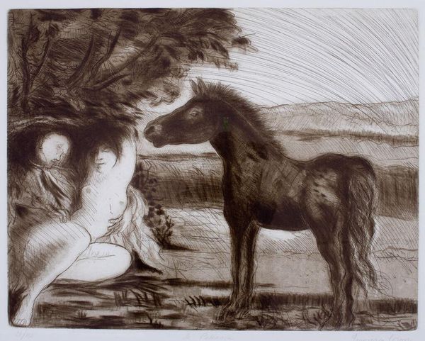 Curator: Frances Richards' print, "Bottom", immediately evokes a sense of dreamlike vulnerability. The figures intertwine, almost melting into one another and the landscape. Editor: Richards, who lived from 1903 to 1985, positions this in a longer history of women artists engaging with surrealism, especially during and after the war, often grappling with themes of sexuality and identity in new ways. Curator: It's interesting you say that, because it doesn't strike me as deliberately shocking. It feels like a safe space, maybe even an allegory, the way the figures huddle together in the pale green light. Editor: Safe perhaps, but consider the original context, its appearance might challenge conventional artistic themes. The piece invites a dialogue on broader societal interpretations of the female body. Curator: I see it as more about inner worlds, that hushed space between waking and sleeping where the animal and human become one. Editor: Exactly! This speaks to how artworks can challenge and shift expectations regarding representation. Curator: Ultimately, it’s that ambiguity, that delicate balance, that holds me captive. Editor: And it's the art's complex and ongoing negotiation with its own history that fascinates me.