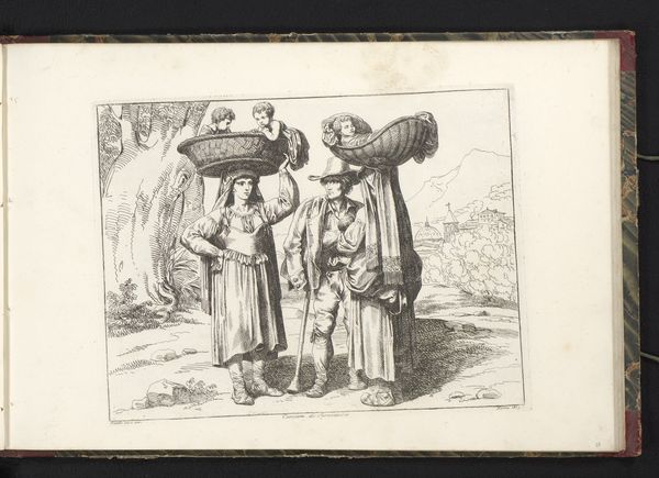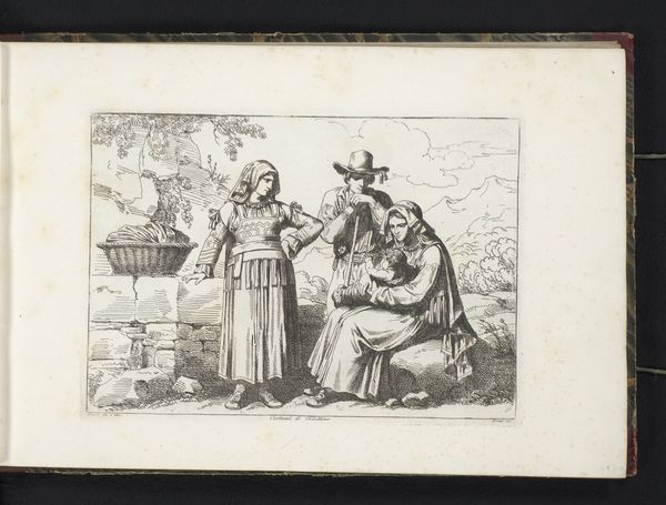 Curator: Bartolomeo Pinelli's etching from 1819, titled "Romeins kind leert lopen" or "Roman Child Learning to Walk," offers a glimpse into 19th-century Roman life. Editor: It has an intimate, almost mundane quality about it. You see the textures of the clothing rendered simply, but with great clarity, emphasizing the weave of the fabrics and the construction of that peculiar walking frame. Curator: Exactly. That "peculiar walking frame" tells us a lot. Not all children had access to such contraptions; it hints at a certain social class. Look at the positioning of the parents too; the father's casual posture suggests his role within the domestic space, while the mother's tender support speaks to prevailing expectations about caregiving. Editor: I'm drawn to the etching technique itself. The clean lines and meticulous cross-hatching, clearly showcase a detailed reproduction through industrial printing, where you could reproduce an intimate scene. It opens a much wider reach for people who consume these kinds of artworks. Curator: Right. And consider Pinelli's larger body of work. He consistently depicted Roman customs, often focusing on the lives of ordinary people. He was attempting to create an Italian national identity, which excluded minority, displaced groups like the Sinti, Roma communities which coexisted and were indigenous to the area at the time. The focus on quotidian Italian-ness reflects and perpetuates a narrow view of culture and race. Editor: So you see the piece almost as a document of social conditioning. To see, even in these images of apparent innocence, you observe something insidious around constructions of nationhood. Curator: Yes, the composition, combined with the medium itself, works on the viewer. And, even though this etching shows a child learning to walk, perhaps the parents represent the expectations weighing heavily on their child and on the very idea of an ideal childhood in that time. It makes you consider how gender and status, as they existed back then, impacted the way people grew up and were taken care of. Editor: Seeing this, I notice so many tiny features in how people lived everyday back then, even within the same space as magnificent, imperial ruins, a juxtaposition worth pondering. Curator: It certainly provides a starting point to unpack many facets of Roman society back then.