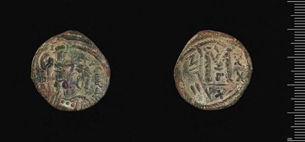Editor: This is a Follis of Tiberius II, Antioch on the Orontes. Looking at the coin's relief and the weathering, I find myself wondering about the marks of time. How do you approach interpreting this kind of work? Curator: Consider the materiality. The wear on the coin, the eroded details—these are not imperfections, but integral components of the artifact’s form. They articulate its history as surely as the emperor’s effigy. Note, too, the incised lines which create the images and text. Editor: So, the coin's physical state is itself a key element? Curator: Precisely. The composition balances imperial authority with the abstract symbolism of power. The medium and its degradation become inseparable from its meaning. Editor: That gives me a lot to think about. I see the coin in a new light now. Curator: Indeed, examining the intrinsic qualities of an object refines our understanding.