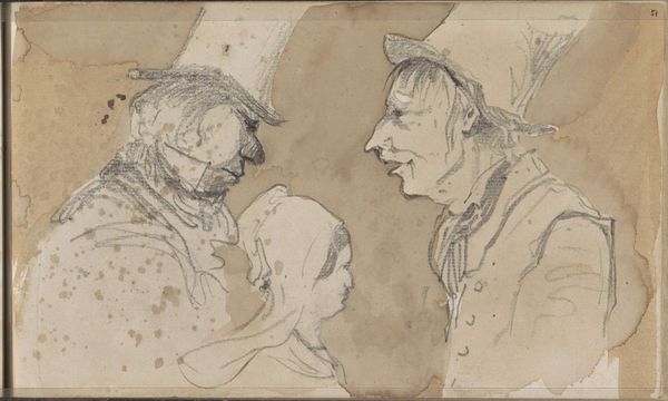 Editor: This is "Illustration to V. Hofmannsthal, \"Andreas\"" by Imre Reiner, possibly from 1944, a drawing done in ink, perhaps later printed. It's really intriguing how just a few lines can evoke so much... a definite air of mystery. What catches your eye when you look at this piece? Curator: Ah, yes, Reiner! What I find particularly evocative is the suggestion of character conveyed with such economical strokes. It reminds me a bit of theatre make-up, especially in how the shading almost sculpts the faces, imbuing them with... well, a *sense* of narrative, if not a completely defined one. Does that resonate with you at all? It almost feels as if we are peering into Reiner's sketchbook. Editor: I definitely see what you mean about the theatrical quality. It’s as if these characters are caught mid-performance. The heavy shadows on the right, especially. I can almost feel the spotlight, but also an incomplete, fragmented sensation that is both suggestive and vague. What do you think that juxtaposition accomplishes? Curator: Excellent question! It suggests, doesn't it, the blurry edges of memory or perhaps even identity. Think of Hofmannsthal’s work itself: often exploring themes of self-discovery and fragmented realities. Perhaps Reiner is mirroring that, inviting us to participate in piecing together the narrative. Maybe that intentional lack of resolution *is* the resolution. It makes you wonder, doesn’t it, what stories are unfolding just beyond the visible. It almost asks *us* to become authors ourselves. Editor: That's a lovely way to put it. I initially felt a bit lost in the sketchiness, but now I see the invitation, this intentional ambiguity. It makes the illustration much more engaging. Curator: Precisely! It's about embracing that open-endedness. The ink blossoms, hinting at untold stories, unfinished symphonies! Now I’m thinking about the book...