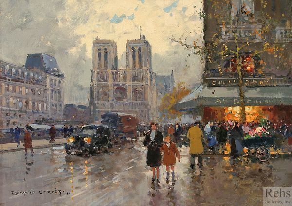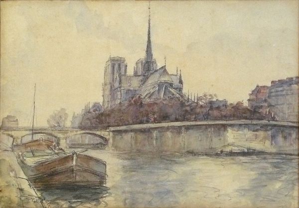 Robert William Vonnoh's 'Notre Dame de Paris' presents us with a symphony of muted tones, where the structural grandeur of the cathedral is softened by atmospheric perspective and light. The composition is divided into distinct horizontal layers. The Seine River and its banks create the foreground, the bridge acts as a middle ground teeming with life, and Notre Dame rises in the background as the city’s architectural and spiritual anchor. Vonnoh uses short, broken brushstrokes, reminiscent of Impressionism, to capture the light as it filters through the Parisian haze. The cathedral, while imposing, is rendered with a delicate touch, its solidity dissolved into the misty air. This is not merely a depiction of a landmark; it is an exploration of how light and atmosphere can transform our perception of form and space. Vonnoh destabilizes the monumentality of the cathedral, inviting us to consider the transient nature of experience and the subjective nature of vision itself. The painting encourages a continued dialogue between the tangible and the ephemeral, the monumental and the intimate.