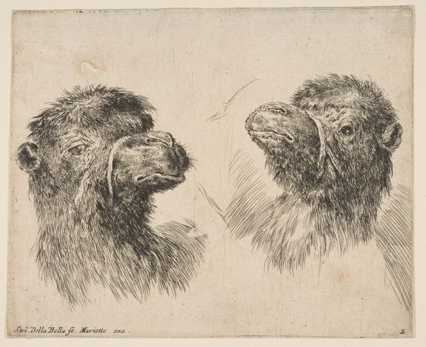 Curator: Look at this Baroque-era portrait of a camel's head by Stefano della Bella, dating from 1620 to 1647. It's an etching. A somewhat peculiar subject, no? Editor: Peculiar, but so gentle. The fine lines of the etching give the camel such a soft, almost melancholic expression. It's like he's seen too many sunsets over the dunes, you know? A quiet wisdom in that eye. Curator: Della Bella, though primarily known for his prints of military scenes and court festivals, clearly had an interest in depicting animals. Prints like these served an important role. The relatively inexpensive nature of prints facilitated the wide dissemination of images for study. Editor: True, but there is more than just accurate portrayal here. It feels intimate, doesn't it? Like the artist spent time just observing the camel, capturing its essence. The lines almost mimic the texture of the fur, the slightly burdened look of the beast... Curator: I agree. Though the artist likely referred to live specimens or other visual resources, the goal was often didactic: the education of the public by presenting a vision of animals—and, indeed, nature itself— within a controlled context. It's interesting to consider what this specific depiction contributed to European audiences ideas about these creatures in this era. Editor: Absolutely. The bit and reins add to the camel's introspective dignity...or perhaps a slight resentment. Imagine being up close to feel the texture of the animal; the coarse hair… even the smell! That doesn’t come across in other artforms, especially sculpture. Curator: Indeed. We can debate artistic intention or our perception, but etching enabled affordable, relatively precise image-making for mass distribution and scholarly use, which in turn profoundly influenced Western ideas about exotic lands. Editor: It is quite striking how much emotion Della Bella conveys with such simple lines. A portrait like this can become a powerful visual reminder of both our connection and potential discord with the animal kingdom. Food for thought as we move ahead. Curator: Indeed. This little etching contains a rich perspective.