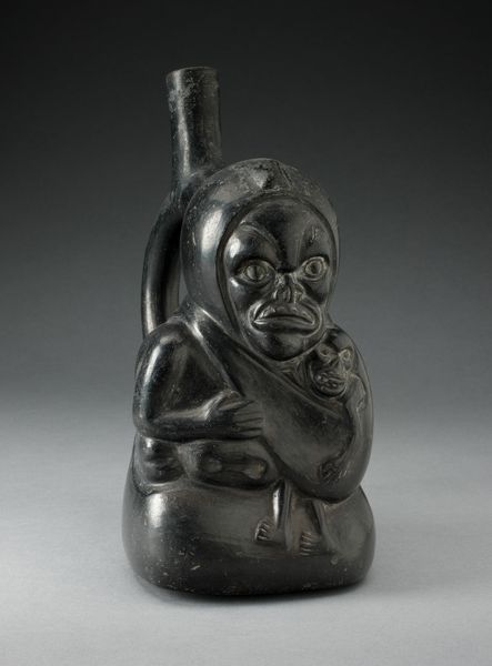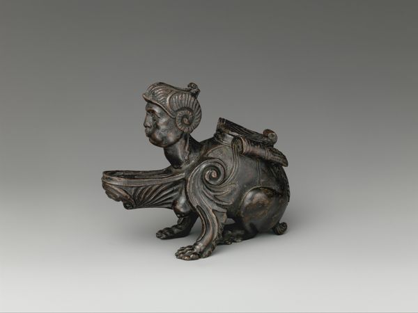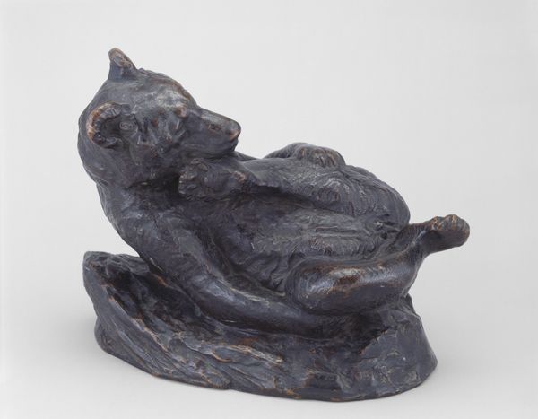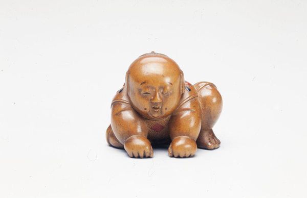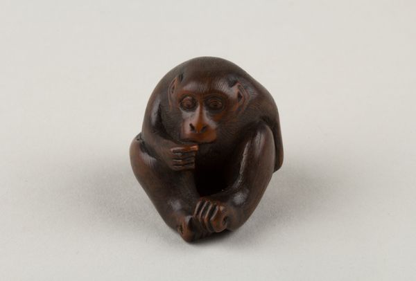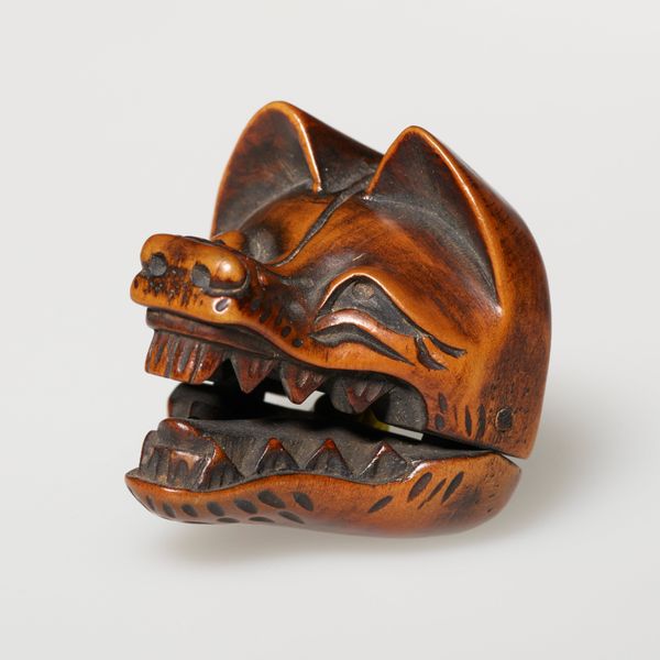 Editor: This is a netsuke, a small wooden carving from around 1800 to 1850, carved by Tomotada, and it depicts a wolf with a turtle. The wolf’s expression is so fierce! What cultural narratives are at play here? Curator: I’m immediately drawn to the relationship between predator and prey depicted. Consider the social hierarchy embedded in feudal Japan. Do you think the wolf represents a dominant class or power structure, perhaps a samurai or ruling family? Editor: Maybe, but the netsuke are, right, supposed to be worn by all classes? Is it possible the artist is playing with those power dynamics, turning them on their head? Curator: Exactly! Consider that the turtle is often a symbol of longevity and stability. Is the artist suggesting that the established order, though seemingly vulnerable, possesses a hidden resilience, able to withstand even the most fearsome predator? How does this connect to political and social unrest during the Edo period? Editor: I see. So, the netsuke might be offering a commentary on power, class, and societal change, masked as an animalistic scene. Curator: Precisely! And what about the choice of materials? How does the smooth, tactile quality of the wood influence our perception of these power dynamics? Does it soften the message, making it more palatable for a wider audience? Editor: Interesting point! The wood does make it feel more intimate and less confrontational. I hadn’t considered the role of materiality in mediating that social critique. Curator: So, the symbolism, social context, material - each is a point for social inquiry, as a lens to understand society. What have you observed? Editor: Now I see it’s more than just a wolf and a turtle. It is about critiquing and playing with ideas about power in 19th century Japan.