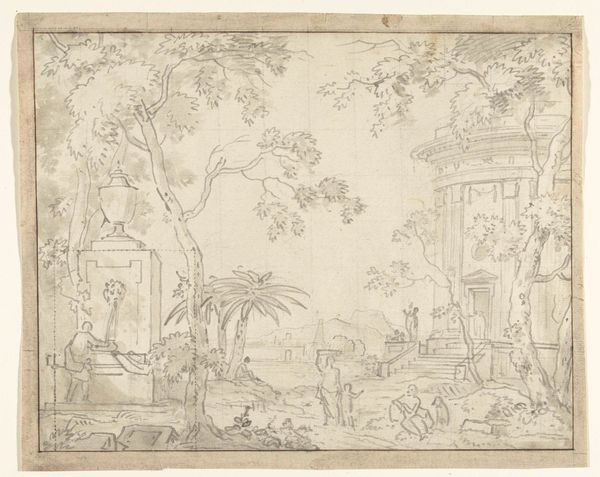 This is a design for a vignette with two putti bearing the coat-of-arms of Holland, made by Gerard de Lairesse using pen and brown ink, with brown wash. The artist seems to have worked spontaneously, with loose and energetic strokes. Looking closely, you can see the varied thicknesses of the lines, the tonal effects created by the wash, and the ways that Lairesse built up the composition. The artist gave careful consideration to the materials and techniques used, and this artistic process contributes significantly to the artwork's aesthetic. This kind of drawing would have been the first step in a longer manufacturing process, translated into an engraving for use in a printed book, or perhaps as a decorative element on a larger work of art. The labor of the draughtsman, the engraver, and the printer would all be essential to the final product. This reminds us that behind every artwork lies a network of skilled individuals and processes, often overlooked in favor of the lone genius narrative.