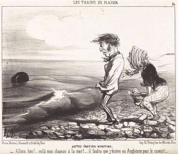 Curator: Here we have Honoré Daumier’s 1855 lithograph, "On dit que le chien est ami de l'homme...". The title translates to "They say the dog is man’s best friend...". Editor: It strikes me immediately as darkly comical. There's a palpable sense of failure in this scene. The stark monochrome and rough strokes add to that feeling of deflation. Curator: Daumier, a master of social commentary, was renowned for his lithographs published in periodicals like Le Charivari. These works served as a visual chronicle of 19th-century French society. Editor: You see that acutely in the figure of the hunter, dressed for sport but clearly inept, while the dog rolls on its back—possibly feigning death, possibly just indifferent. There is material waste in these failed ventures. What would be consumed, now will not. Curator: Absolutely. Daumier cleverly utilizes caricature to critique the bourgeoisie's aspirations. The exaggerated features of the hunter, the thin legs, and overly large head, expose the ridiculousness of his attempt at leisure and status. Editor: The choice of lithography as a medium is essential. It allowed for mass production, making his social critiques accessible to a wide audience. The material properties of the lithographic stone and the greasy crayon facilitated a rapid production workflow suitable for newspapers. Curator: And that speed meant that the work would remain pertinent, contributing to the debates of the moment. We see his skepticism toward traditional power structures. In this period, access to hunting was tightly bound to social status and economic means. Daumier highlights its performative aspect. Editor: There's a direct challenge to the notion of work and reward, also, the traditional hunting scenes where humans and animals cooperate in a kind of productive harmony are upset here. Instead, the land remains unchanged; the social order unaltered. Curator: It makes you consider the political weight that a simple, reproduced print can possess. Editor: And how the social commentary becomes deeply entwined with the materiality of printmaking and distribution of art. Curator: A final sardonic, lasting observation on human-animal relationships and class pretension. Editor: Indeed, a wryly rendered reminder of the gap between idealized social roles and material realities.