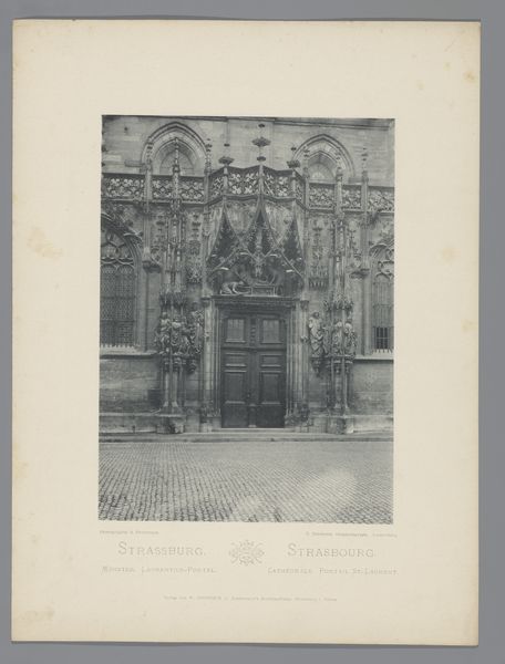 Curator: This albumen print from 1877, captured by Sophus Williams, presents the north entrance of Strasbourg Cathedral. I'm struck by how the photographic process captures the ornate Gothic architecture. Editor: Immediately, I’m drawn to the almost ghostly presence of the architecture; the light plays in such a way to obscure any kind of groundedness. The cathedral's stone facade appears almost like a fragile paper construction, all planes and relief, but no actual volume. Curator: Right. It's a compelling example of how photography, even in its early stages, could transform our perception of established symbols. The cathedral, of course, was a symbol of faith, power, and civic pride, and Williams is documenting that for the people. Editor: And documenting using fairly new industrial processes! Think of the labor involved – quarrying, transporting, carving all of that stone, versus the emerging photographic reproduction allowing it to circulate… which suddenly makes something that was quite material quite reproducible and consumable. Curator: Precisely. The portals are framed by such intricate carvings – figures frozen in time, geometric patterns reaching towards the heavens. What narratives, what lessons were etched into the stone for the faithful to absorb? Each gargoyle, each arch, tells a story that has a life far beyond it's materials! Editor: And each craftsman that added to the buildings – what was their personal narrative, versus the kind of universal ones we see projected through the images, figures, and design itself? I guess the act of documenting – and preserving something – it both takes us away and preserves a time, place, feeling, even… Curator: Agreed. It gives one pause, reflecting on how the camera transforms the tangible into something ephemeral yet enduring, and how that shifts the role of symbols. Editor: Yes – it makes one think about how labor and effort in building cathedrals, then photographic practice intersect and evolve the means of visual experience itself. Thanks.
