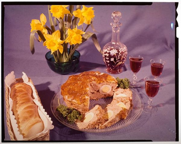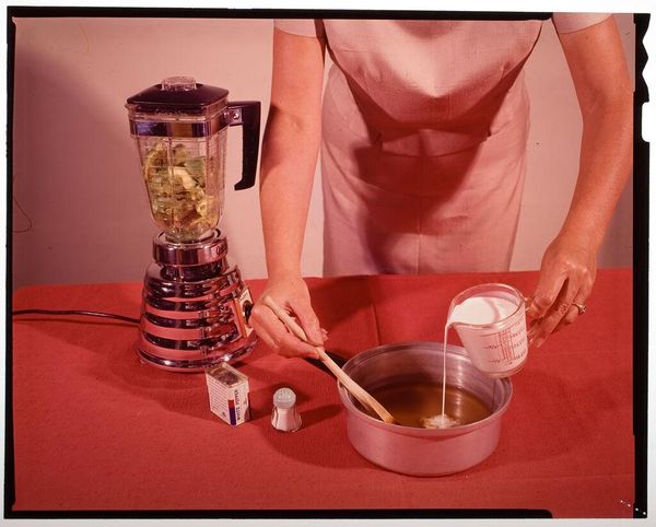 Curator: Here we have Jack Gould's photograph, subtly titled "Untitled (chef spooning fruit cocktail into goblets)." Editor: My first thought is that the composition is quite formal, almost a still life, despite capturing a moment of action. The red tablecloth dominates, doesn't it? Curator: Indeed. Note the context of mid-century domesticity, perhaps a glimpse into gendered labor roles and the presentation of idealized, palatable cuisine. The strategic arrangement of the ingredients also highlights the artifice. Editor: I'm particularly drawn to the contrast between the sharp lines of the glassware and the organic forms of the fruit and lettuce. It creates a really interesting visual tension. Curator: And consider the broader cultural implications. The fruit cocktail speaks to ideas of accessibility and convenience. What does this photograph reveal about our relationship to food production and consumption during this period? Editor: Yes, those formal choices seem to underscore those questions. The composition itself becomes a statement. Curator: Precisely. It makes me wonder about the social implications it implies. Editor: Well, thanks to Gould’s careful arrangements we have a lot more to consider.