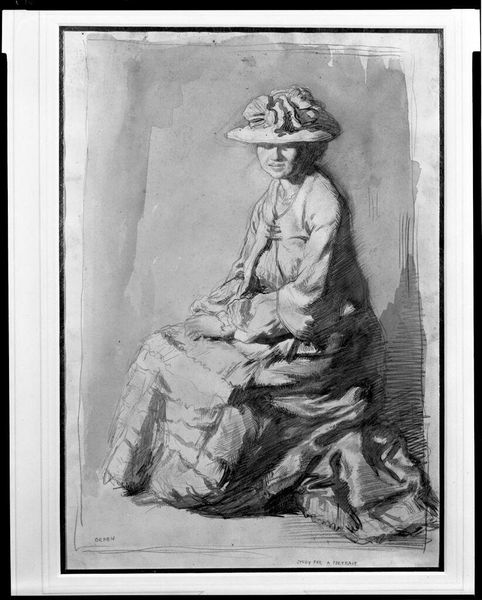 Curator: This portrait drawing, seemingly titled "Czobel Lappang.." is by Bela Czobel, an ink on paper piece with modern undertones. It evokes such a striking feeling right away. Editor: There's definitely something unsettling, almost severe, in her expression. The artist uses rather flat applications of ink, yet there's a dimensionality created through the subtle shading. Notice how that delineation is very concise? It shapes the contours, creating an elegant linear structure within the planar approach. Curator: Absolutely, the planar approach has significant bearing within modernism. Beyond the purely formal elements, there's a palpable intensity in her gaze. Czobel painted several portraits; however, the lack of clarity on dating means pinning down definitive sitters, stories or societal reflections within the sitter's status gets difficult here. Do we have insight to shed? Editor: In a sense, the historical anonymity almost strengthens the drawing’s symbolic potential. Perhaps we are looking at the formal qualities creating this response? Note the hat framing the face with what is a geometric quality, versus softness, versus curves and her very intentional seated profile positioning within the frame: very intentional and not soft. The weight of it all presses upon my feeling it could reveal a deeper exploration of identity, almost. Curator: Precisely! Look closer and how can we decode the language? Do her stylistic distortions act to disrupt and make us look deeper, like some others of the modernist approach? One cannot just casually gaze but rather contend. The sharp features—almost angular jawline—and simplified form all contribute to a reading beyond simple mimesis. Editor: It’s difficult to avoid some degree of psychoanalytic interpretation here too. Look closely—there is intentional contrast, and a lack of specific time elements almost to me seems it reflects how Czobel saw how an image exists both within, outside, and independent of. Curator: Very well said. The impact of the piece stays strong well past a simple glance because it stays in your memory even when you've turned away. Editor: It’s the marriage between his technique and the emotional aura captured which grants it impact, and what’s amazing, that the artwork, even absent of contextual facts, makes that lasting impression.