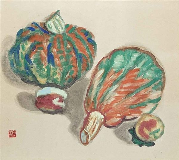 This vibrant still life by Mahmud Taghiyev presents us with a seemingly simple arrangement of fruit, rendered with dynamic strokes of ink and color. These fruits, traditionally symbols of fertility, abundance, and temptation, carry echoes from the Garden of Eden to Cezanne's explorations of form. Consider how the motif of the fruit appears in Caravaggio's "Basket of Fruit", laden with symbolic decay, a memento mori. Here, in contrast, Taghiyev’s fruits burst with color, an unrestrained celebration of life, and a feast for the eyes. The bold lines and vivid hues resonate with a primal energy, tapping into our collective memory of nature's bounty. The non-linear, cyclical progression of this symbol shows the way fruit, from ancient myth to modern art, continues to feed our imagination, constantly evolving with each brushstroke.