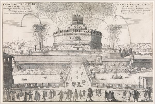 Curator: This engraving is titled "Speculum Romanae Magnificentiae: Castello Sant' Angelo," and it was created sometime between 1530 and 1580 by an anonymous artist. Editor: The print has an impressive, almost overwhelming feel, a density in its lines that captures the weight and permanence of this ancient structure, yet at the same time feels detached, as though viewed from afar. Curator: Indeed. The “Speculum Romanae Magnificentiae,” meaning "Mirror of Roman Magnificence," was a publishing project intending to celebrate and document ancient Roman monuments. This print, like others in the series, served not only as documentation but also as a symbol of papal power. Editor: Looking at the architectural details, it strikes me how the artist uses line to differentiate textures – the smooth, dressed stones near the top of the Castello contrasting sharply with the rougher, more rugged base. How do you see that formal choice relating to its political function? Curator: Well, the Castello Sant'Angelo itself has a complex history. Originally built as Emperor Hadrian's mausoleum, it was later integrated into the Vatican's defenses. Its transformation reflects the papacy's ability to adapt and dominate existing structures of power. It also tells of the Church’s appropriation of Roman legacy as their divine right to rule. Editor: You know, focusing on the linear aspect, I find a remarkable contrast. On the one hand, there's this detailed rendering of architectural elements—the walls, battlements, the bridge spanning the river—yet the human figures are almost abstract, like little sketches populating the landscape. Curator: I believe it indicates an emphasis on the enduring nature of institutions versus the ephemeral existence of the people, whose individual identities are of little consequence against such formidable political infrastructure. It evokes broader narratives of gendered roles too, I think. Architectural engraving and other precise skills were gendered male during the Italian Renaissance. Editor: It also could highlight the artist's compositional concerns in his contrast of static architecture with organic, dynamic shapes in the cityscapes to underscore both. Regardless, the dialogue it sets up creates a real charge. Curator: It’s through unpacking these layered elements, and by acknowledging art's engagement in cultural discourse, that we can better grasp this work's historic function as an agent of civic identity formation and power display. Editor: Right. Appreciating that delicate balance between form and function is key to understand and truly admire artworks like this.
