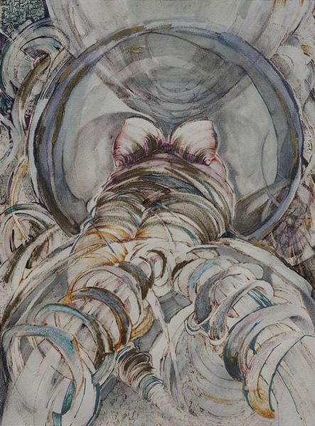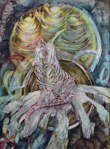 Małgorzata Serwatka made this painting, Dauka 7, layering ink and acrylic in a way that feels both considered and spontaneous. You can see how the swirling forms almost materialize from the surface, like thoughts taking shape. I find myself drawn to the texture here, the way Serwatka builds up the surface with these calligraphic strokes and layers. There's a real physicality to the marks, like she's wrestling with the materials to bring these images into being. Note the pale pink curves at the top, they seem to both emerge from and recede into the background, which is built from chaotic grids of tiny characters. These shapes call back and forth across the surface in a rhythm that almost feels musical. There's something about Serwatka's process that reminds me of Cy Twombly, in the way she embraces the messy, uncertain nature of artmaking. It's a reminder that art is never really finished, but is always in a state of becoming.