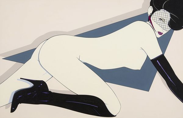 Editor: We're looking at "Pin-Up in Fishnet" by Patrick Nagel, likely an acrylic. It feels so… stylized and detached, even a bit cold. What's your take on it? Curator: Well, that coldness, that stylized detachment, is precisely what Nagel evokes. What do you see in the sharp geometric shapes, the limited palette? What symbols are resonating? Editor: I notice the sharp lines, the flat color planes. The woman’s expression is unreadable. I suppose the fishnet implies some form of sexuality, but it feels very controlled, very deliberate. Curator: Exactly. Consider the fishnet, a recurring symbol of feminine allure. But here, the netting isn't soft and inviting; it’s a rigid grid, almost cage-like. How might this imagery engage with prevailing ideas about women at the time Nagel was most prolific? Editor: So it's a comment on objectification maybe? This kind of vacant gaze and graphic style remind me of advertising, selling an idea of beauty more than portraying a real person. Curator: You’re honing in on a vital aspect of the piece. The work functions as both celebration and critique, creating tension. Consider the time. The 1980s saw a fascination with consumerism, but also a rise in feminist discourse challenging established gender roles. This piece captures that friction perfectly. Does this visual dialogue provide us a potential cultural snapshot? Editor: Yes! It gives me so much more to consider when I see this work. I had been thinking about the pose and colors only. Thank you. Curator: Indeed. These images are never just about what's on the surface; they echo cultural memory, fears, desires, continuously transforming through symbols across generations.