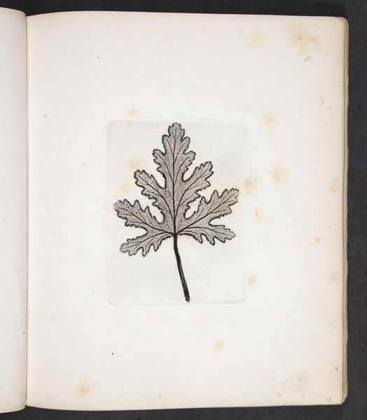 Editor: We're looking at "Aftryk af rosenblade," which translates to "Imprint of Rose Leaves," made by Peter Larsen Kyhl in 1833. It appears to be an etching, a print of a simple rose leaf against a stark white background. It's incredibly delicate. What stands out to you about this piece? Curator: The most compelling aspect is its formal structure. Note the delicate articulation of the veins within each leaf, achieved through meticulous etching. Observe how Kyhl exploits the stark contrast between the positive and negative space, essentially the printed area and the untouched paper. Does this visual tension evoke a particular feeling in you? Editor: It makes me think of early scientific illustration. Very precise but also quite beautiful. The negative space feels almost as important as the leaf itself. What about the texture? Curator: The texture, particularly that achieved via the etching process, is vital. Consider the lines— are they uniformly applied, or do they vary in pressure and thickness? How does the linear structure interact with the ovoid shape of the leaves themselves? Think of this piece as an exercise in visual dynamics, rather than just a static image of a leaf. It embodies structuralism ideals, as the composition becomes the main meaning. Editor: That’s a helpful way to see it, by focusing on the relationship between those elements. So, it's less about what the leaf *represents* and more about how it's represented. Curator: Precisely. It exemplifies how intrinsic visual qualities construct meaning. Form precedes content. This piece certainly provides insights to future etchers for similar forms to emerge and re-configure art history. Editor: I appreciate the insight; I was so focused on the subject that I didn't initially recognize how much the execution dictated the artwork's character. Curator: And hopefully, that provides another framework to better see artforms more completely in future visits!