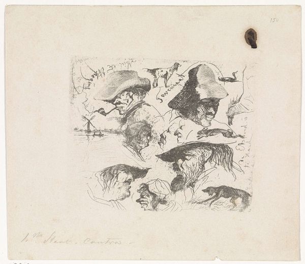 This is "24 representations of horses, riders and skirmishes" by Gottfried Chodowiecki, made with etching. The artwork presents a series of small, detailed sketches arranged in a grid, creating a sense of ordered chaos. The composition is defined by the contrast between the delicate lines of the figures and the blank space around them. Each sketch captures a moment of dynamic action, yet the overall effect is one of stillness, almost like a scientific study. Chodowiecki uses the etching technique to create a range of textures, from the smooth surfaces of the horses to the rough textures of clothing. This attention to detail is characteristic of the Enlightenment period, which emphasized observation and empirical knowledge. The grid layout of the sketches invites us to compare and contrast the different poses and interactions, highlighting the artist's interest in capturing the nuances of human and animal movement. It reflects broader artistic and philosophical concerns with understanding the world through systematic observation.