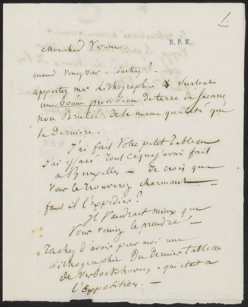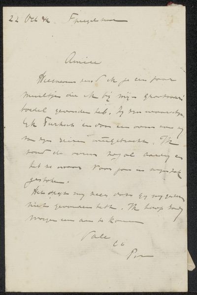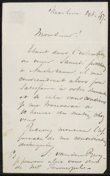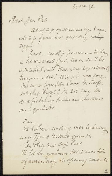 Willem de Zwart crafted this letter to Johan Philip van der Kellen in 1890 with ink on paper. The visual experience of the artwork is defined by the calligraphic lines of the handwritten text, arranged in a composition that balances clarity with aesthetic appeal. The color is subdued, with the dark ink contrasting against the off-white paper, lending it a timeless quality. The structure of the letter reflects a delicate interplay between form and function. The lines of text, while conveying information, also create an abstract pattern across the page, engaging with the viewer's eye. This balance mirrors the artist's broader interest in exploring the semiotic relationship between written language and visual art. Ultimately, De Zwart’s letter exemplifies how everyday communication can transcend its immediate purpose to engage with broader artistic and philosophical concerns. The artwork destabilizes fixed meanings by presenting itself as both a practical message and a thoughtful aesthetic object. It’s an invitation to reflect on the continuous re-interpretation of art as a cultural and philosophical site.