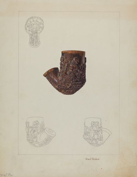 This image shows Carl Keksi’s rendering of a pipe bowl, done in graphite and watercolour. There’s a real skill in making these materials look so sculptural. What gets me about this piece is the making of the image, it’s so delicate, and precise. Look how the hatching builds form, describing texture and depth. It’s like Keksi is showing us not just the object, but also his understanding of it. The details, like the leaves and acorns, and the portraits, have this tactile quality; you can almost feel the original object in your hands. And then there’s the color. It’s so restrained, so earthy. It gives the whole thing this quiet, contemplative vibe. It's not about showing off, but about really seeing. For me, this work speaks to a dialogue with the old masters, maybe someone like Durer. It’s like Keksi is asking, what does it mean to make an image in our time? It's a reminder that art is always in conversation, always building on what came before, but in a new way.