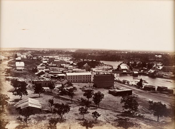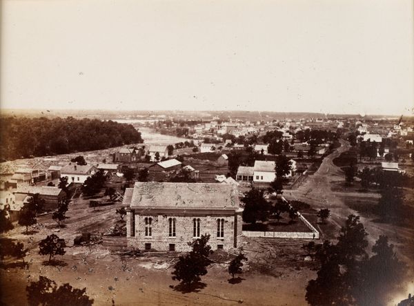Editor: This photograph, titled "Commissary Department, Alexandria," taken by Andrew Joseph Russell, presents a stark, almost unsettling scene. The composition feels very horizontal. What do you see in the image's structure? Curator: Indeed, the composition uses a strong horizontal emphasis. Note how the receding lines of the buildings and trains create a linear perspective, dividing the picture plane into distinct bands. How does this geometry affect your perception? Editor: It makes it feel very rigid, almost like it's compartmentalizing space. Curator: Precisely. Consider the tonality as well. The limited gray scale and subtle variations in light reinforce this structural severity. Do you find any points of visual relief? Editor: Perhaps the distant cityscape offers a slight contrast with its varied shapes, but it seems muted, as if bound by the same visual logic. It's as if the photo's structure creates a certain mood that pervades the whole scene. Curator: An astute observation. I concur. The photograph's formal elements work in concert to create a sense of order and constraint.