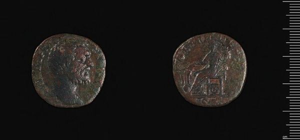 Curator: This is a sestertius of Alexander Severus, residing here at the Harvard Art Museums. Editor: There’s a somber mood evoked by the patinated bronze, almost a visual echo of time's passage. Curator: The value of this coin lies not only in its monetary worth but also in its representation of power. The material itself, the bronze, would have been carefully sourced and controlled. Editor: And speaking of power, the image of the emperor is striking, almost god-like. But then, on the reverse, we have this figure—perhaps Roma? Minerva? The symbols are loaded with intent. Curator: It's fascinating to consider the labor involved in its creation. The mining, the smelting, the die-cutting. Each step carries social implications. Editor: Absolutely, and the choice of imagery broadcasts the empire’s values and aspirations. Curator: Indeed, a small object, yet it reveals so much about Roman society and its production. Editor: Yes, it's a rich glimpse into a distant era.