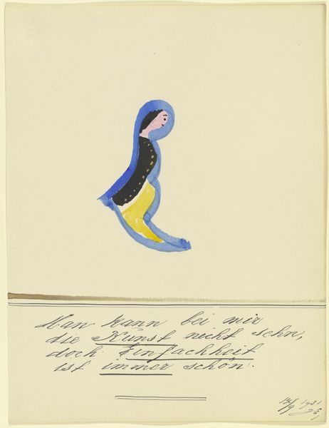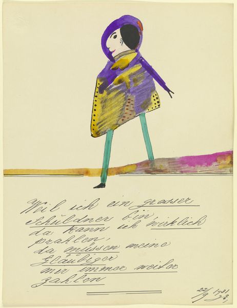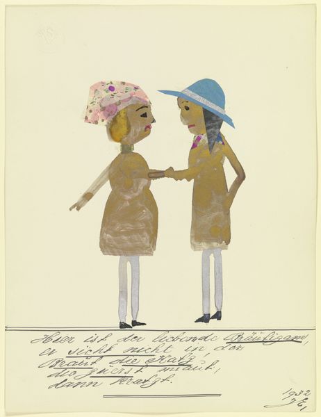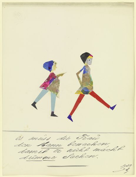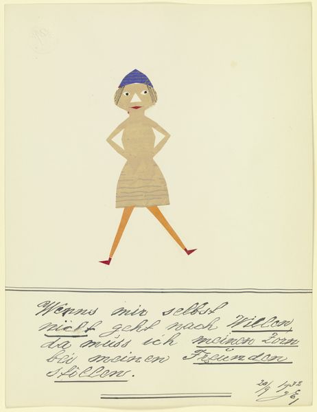 Curator: We’re standing before John Elsas’s 1932 artwork, “17554 ('Weil mein Bild ist modern …')”, a collage that includes gouache, ink, and paper elements. What strikes you immediately? Editor: The colours, definitely. It feels like children's book illustration, yet there’s something unsettling in its construction. What paper has the artist selected? Is there any mass-produced source material mixed with individual drawings? Curator: Absolutely, the playful simplicity clashes with the work’s historical context. Elsas created this piece during a time of great social upheaval. As a Jewish artist working in Germany in the 1930s, his identity was inherently political. The text below the image says something interesting as well… Editor: "Because my picture is modern, the world likes me." It’s ironic and revealing when considering the political climate and materials used by Elsas. Let's look at the process of collage, of piecing together scraps. It's not just about the image, but about repurposing pre-existing materials into a completely different visual narrative. Curator: Precisely. The materials signal a modern subjectivity pieced together from societal fragments. His bold use of figuration set against modernist aesthetics speaks to the ways in which personal identity becomes a stage for societal pressures. I'd be interested to see how gender and identity were performed by the artist through material. Editor: And the labor itself becomes apparent through the cut and paste assemblage. The edges of each piece of paper are visible and not always neatly aligned, underscoring the artificiality and deliberate act of construction. I also would question whether the title's use of 'modern' meant merely new art, or something else…perhaps a sly social commentary through means of production, rather than simple form or colour. Curator: That question is key. This layering, both physically and metaphorically, invites us to interrogate what “modern” meant for someone like Elsas, forced to confront both aesthetic expectations and increasingly dangerous social realities. I see his self-representation as a radical act. Editor: I’d also agree that the self-conscious materiality and construction are indeed defiant, turning what may seem as "craft" into a forceful personal statement and means of resistance. Curator: Elsas reminds us how intertwined identity, history, and artistic expression become, particularly in moments of crisis. Editor: He is inviting us to appreciate art as the conscious product of making that’s in constant dialogue with the forces, tools, and politics of material production.