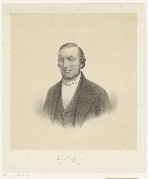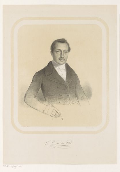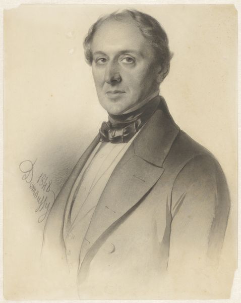 Editor: This is *Portret van Jan Jacob Hinlopen*, made around 1842 to 1880. It's a portrait of a man, created with pencil, and housed here at the Rijksmuseum. The detail is incredible! I'm curious about what stands out to you when you look at this piece. Curator: Initially, I'm struck by the interplay of light and shadow that models the sitter's face and clothing. Observe the artist’s skillful use of hatching and stippling to create tonal variations, adding volume and texture. Note how this detailed treatment contrasts with the relatively bare background, forcing the viewer’s focus upon the man's bearing. Editor: Yes, it does really bring out the man's features. I'm also intrigued by his formal attire. Does the style of his clothing reveal anything? Curator: It certainly does. Notice the high collar, cravat, and tailored jacket—all elements indicative of upper-class status and societal expectations in that era. However, consider how the soft rendering and almost idealized portrayal transcend simple documentation. Are we meant to consider the man as an individual, or a representation of status? Editor: That’s a fascinating point! It makes you question what the artist prioritized. I learned a lot by examining the formal elements today! Curator: Indeed. Through such analysis, the pencil strokes are a code by which we can discover intended and unintended narratives of social representation.