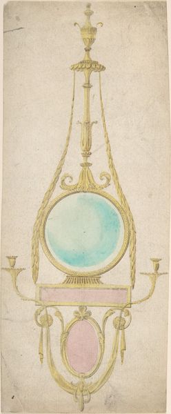 Sir William Chambers designed this oval mirror with pen and gray ink, with gray wash and green watercolor on laid paper. Notice how the composition is dominated by the oval form, a shape that softens the strict geometry of Neoclassicism while maintaining symmetry and balance. The green wash fills the mirror's surface, contrasting with the detailed, monochromatic ornamentation. This color choice is not merely decorative; it evokes a sense of renewal, aligning with the era's fascination with classical antiquity and its ideals of harmony. Chambers uses swags and an urn to frame the mirror, elements that speak to the 18th-century obsession with classical motifs. The meticulous rendering of these details suggests a desire to revive and reinterpret ancient forms. The mirror, as a symbol, becomes a site of reflection—both literally and figuratively—inviting viewers to contemplate their place within the grand narrative of history and aesthetics. The interplay between the detailed ornamentation and the smooth, green field destabilizes any fixed notion of beauty, suggesting that true elegance lies in the fusion of form and idea.