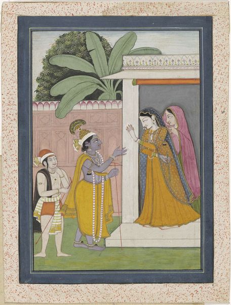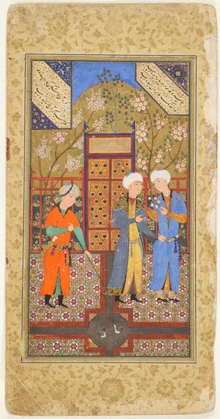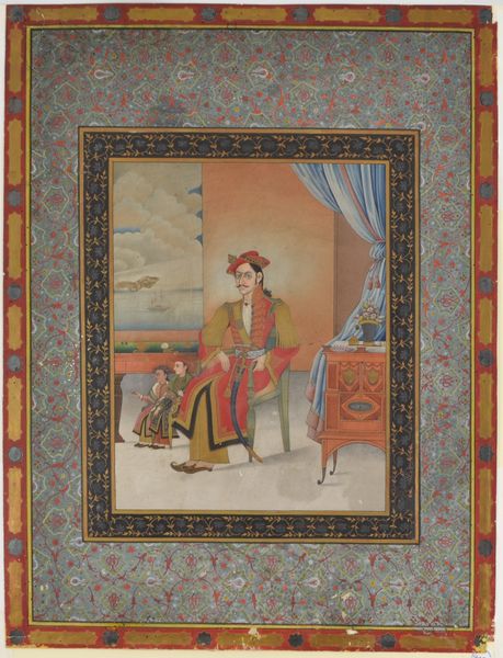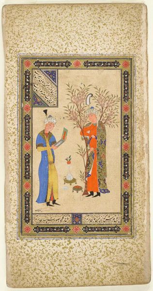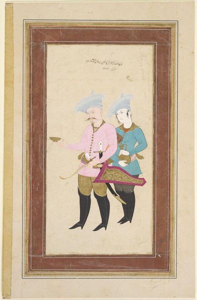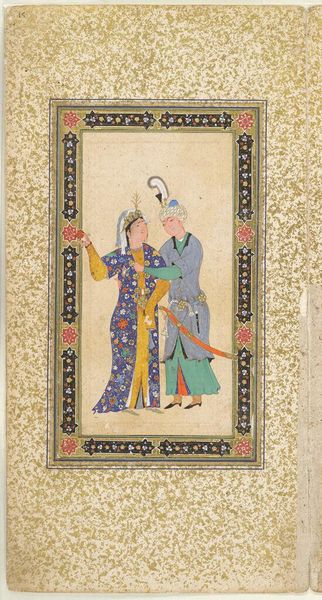 Editor: Here we have "Lovers with Wine" attributed to Mir `Ali Haravi. It's a small painting, part of a folio, depicting two figures in elaborate robes. The gold leaf is striking! What can you tell me about this work? Curator: The materiality speaks volumes. Consider the labor invested in preparing the pigments, grinding them, applying gold leaf so meticulously. This wasn't mere decoration; it reflected status, power, and trade networks that brought these materials together. How does that context change your initial reaction? Editor: It makes me think of the cost and the privilege behind such detailed work. It's no longer just pretty, it's about the economics of art-making. Curator: Exactly. The painting itself becomes a document of its own production, reflecting the social and economic structures of its time. Understanding that labor is key to interpreting the image. Editor: I see the painting differently now, it is a confluence of labor, trade and social position. Thank you. Curator: And I appreciate you bringing fresh eyes to the materiality that shapes our perception.
