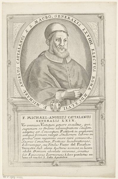 Curator: Looking at this engraving, the subject is clearly someone of importance. This is a print dating from 1710 to 1738, titled “Portret van Giovanni da Parma, 6de Minister Generaal van de franciscaner orde” and created by Antonio Luciani. Editor: It feels so austere, almost minimalist in its approach, given the density of the calligraphy that surrounds the portrait. The figure seems self-contained, internal. Curator: That inward focus, I think, is heightened by the technique. Luciani uses these incredibly fine, almost microscopic lines to build up the form. It's a testament to the artist's control and precision and typical for the baroque era. The limited shading directs your gaze precisely, doesn’t it? Editor: Yes, everything about this seems controlled, from the deliberate inscription that circles the portrait to the meticulous rendering of his robes. His hands, clasped gently, seem like the calm centre of this very formal presentation. It also creates, at least to me, a certain psychological distance. It's like we are viewing an icon, not an individual. Curator: Absolutely. The text surrounding the image, describing Giovanni's virtues and deeds, reinforces this. The halo indicates the saintly status awarded. It is there to solidify Giovanni's reputation and reinforce the authority of the Franciscan order. The choice of calligraphy, the swirling flourishes... Editor: The text grounds the visual. Do you think the austere qualities underscore the dedication to the spiritual calling? It almost serves as its own meditative frame for such devotion, if you consider the content that the OCR reading reveals. Curator: It certainly lends itself to that reading. Considering Giovanni da Parma's own advocacy for poverty and the strict observance of the Franciscan rule, that sense of humility conveyed through the work really speaks to Luciani's interpretation. Editor: It is indeed a remarkable achievement; the visual economy speaks volumes about both subject and intention. Curator: Agreed. I can appreciate now, looking back, that what appears as "minimal" can also serve to emphasize specific important details. It really adds weight to that personal touch.