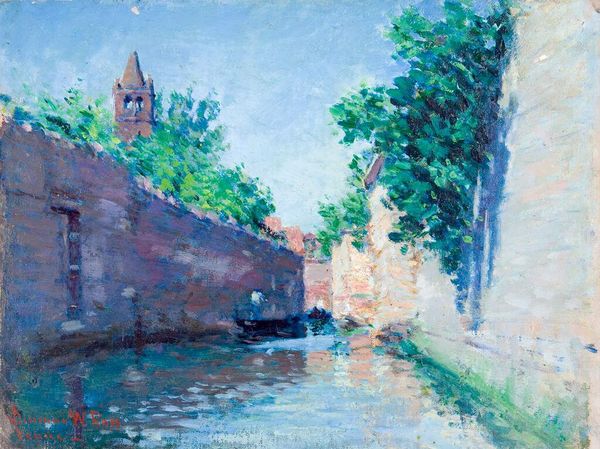 Curator: Before us hangs Emile Claus’s "Canal in Zeeland," painted in 1899. Claus, a significant figure in Belgian Impressionism, captures a seemingly everyday scene. Editor: Immediately, I'm struck by the hazy light and how it shimmers on the water’s surface. The muted color palette, punctuated by warmer tones in the architecture, gives it a dreamlike quality. Curator: Claus was part of a broader movement challenging academic painting, focusing on modern life and the effects of light and atmosphere. Artists like Claus depicted the changing landscape affected by industrialization and urbanization, choosing to represent ordinary life in a modernizing society. Editor: Absolutely, and it's visible in the loose brushwork and broken color that create such a sense of movement and impermanence. Note the way the artist applies paint in small, distinct strokes to capture reflections in the water. It suggests an attempt to break the reality into component visual parts. Curator: Indeed. He was exploring how we perceive the world, not merely recording it. Consider the setting of Zeeland; it was then, and still is, a province undergoing considerable transformation. Paintings like this documented those changes while framing them as picturesque. These landscapes became tools for creating national and regional identity. Editor: It's compelling to consider the social aspect of it, alongside his attention to detail. The light, the color choices – they all coalesce to affect our sense of visual reality. The formal qualities draw the eye to appreciate it in a visceral way, regardless of historical considerations. Curator: Art serves a dual purpose, does it not? Both as a reflection of the present and a consideration for the future, so historical considerations become essential to forming comprehensive and grounded artistic perspectives. Editor: Very well, a balanced outlook. Claus's painting gives us a window into a past moment while subtly bending our perception of the very matter of which the world around is comprised. Curator: And that’s a gift we should all appreciate.