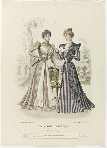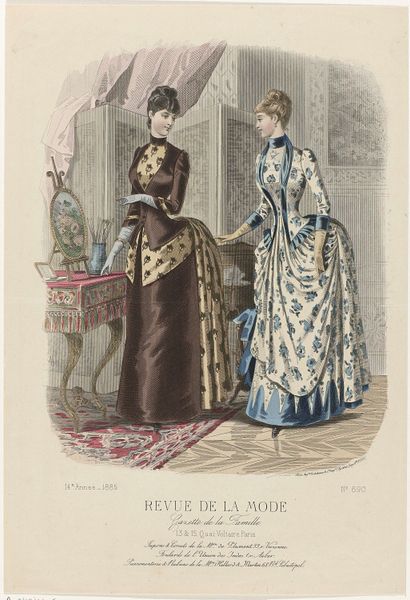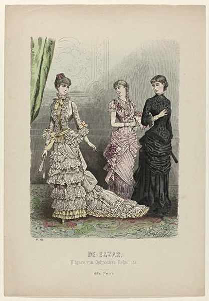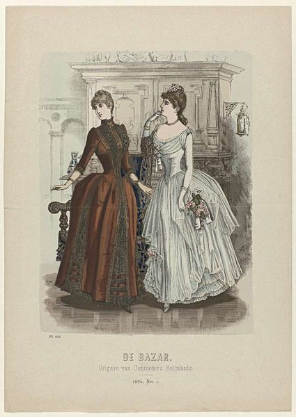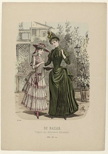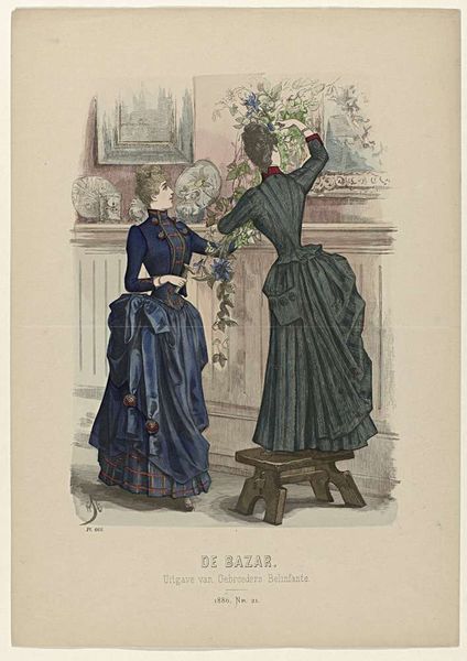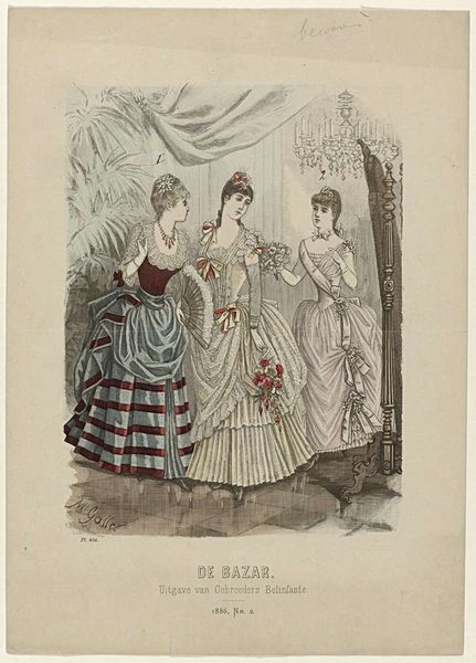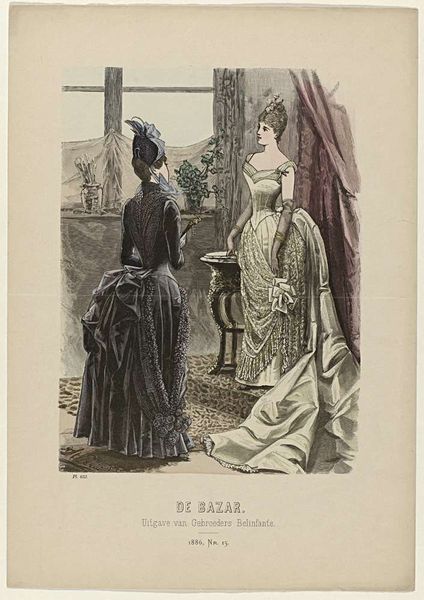 Editor: This is a lithograph called "De Bazar, 1886, Nr. 13, Pl. 650," created in 1886. It portrays two women seemingly observing art in a gallery, although they steal the show with their own dazzling outfits. What’s your initial reaction, and how would you interpret this piece? Curator: Oh, I find this lithograph so telling of its time, don’t you think? The piece really speaks volumes about late 19th-century consumer culture and the burgeoning role of women in that sphere. To me, it's not *just* about two women at an exhibition; it’s a snapshot of a society fascinated by appearances and perhaps starting to question the very notion of 'high art'. Are they truly captivated by the art, or is it simply another backdrop for their social display? It feels playful, doesn’t it? A bit cheeky. Editor: I agree. There is almost a satire to the detailed emphasis on their dresses compared to the haziness of the artwork on the walls. How do you think the context of the print, as a possibly mass-produced image, adds to this understanding? Curator: Precisely! The fact that this image *itself* was likely part of the bazaar of images in circulation… it adds a delicious layer of irony, wouldn’t you say? Perhaps even hinting at art becoming another commodity in the grand bazaar of modern life. Do you get a sense that it could be calling into question the values being presented? I do. It is almost poking fun. Editor: Definitely, I see it now! It is quite brilliant, the way it layers commentary on consumerism, art, and society. I initially saw just a pretty picture, but it's so much more complex. Thanks! Curator: Isn't that the delight of discovering art? It often reflects more than what's immediately apparent. I appreciate your perspective as well!