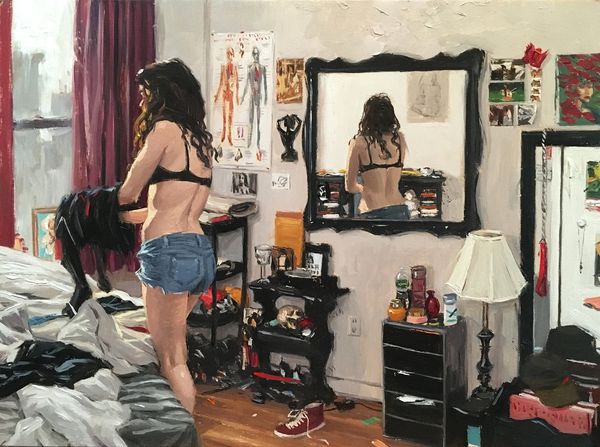 Vincent Giarrano painted ‘Her Journal’ with oil on canvas. The artist, born in 1960, offers a contemporary scene that subtly engages with themes of personal identity and expression. Giarrano captures a young woman in a private moment of reflection, writing in her journal. Her personal style—the plaid skirt and high socks—might suggest a reclamation of identity, and a conscious divergence from mainstream norms. This portrayal moves beyond traditional representations, offering an alternative narrative where personal style becomes a form of self-assertion. The grid of small paintings behind her creates a backdrop that speaks to the myriad of influences that shape her world. This piece allows us to reflect on the quiet acts of self-discovery that define our identities. What will she write? What are her dreams and ambitions?