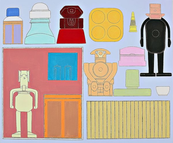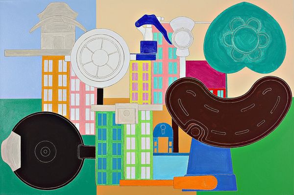Alfio Giuffrida made this painting, CD Homes, with simple, graphic shapes and a limited palette. It's like he's playing with building blocks, but instead of making a realistic scene, he's giving us a puzzle of forms and colors. I love how Giuffrida embraces flatness. The colors are bold and opaque, laid down in distinct areas with clean edges. Look at that large central form—it’s black and red, like a game of Candy Land, but is it a building? A face? The windows are like eyes, but they’re filled with a pale yellow light. The textures are smooth, and there are no visible brushstrokes, as if he's trying to hide the hand that made it. This work feels like a dialogue with painters like Stuart Davis, who also used bold colors and geometric shapes to create lively, abstract compositions. Giuffrida invites us to see the world not as it is, but as a collection of shapes, colors, and possibilities, and it’s up to us to decide what they mean.