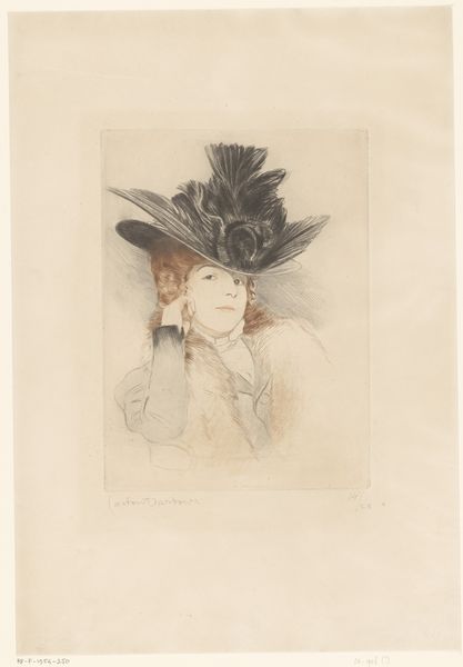 James Tissot made this print, “The Rubens Hat,” using etching, a process where a metal plate is covered in a waxy, acid-resistant ground. The artist then draws through the ground, exposing the metal, before immersing the plate in acid. This eats away at the lines, which are then inked and printed. The resulting image has a distinctive, slightly irregular line quality. Consider the social context: Tissot was a painter of modern life, and this print captures the elegance of Parisian fashion. But the image also reflects the labor involved in producing such finery. The hat itself, with its ribbons and plumes, would have been the product of skilled milliners, while the woman's dress suggests the work of dressmakers and seamstresses. By focusing on these details, Tissot reminds us that even the most seemingly effortless displays of style are rooted in specific processes of making, and a network of workers and skilled crafts. This challenges the traditional art historical emphasis on the artist’s singular vision, highlighting the collaborative and often unseen labor that goes into creating cultural artifacts.