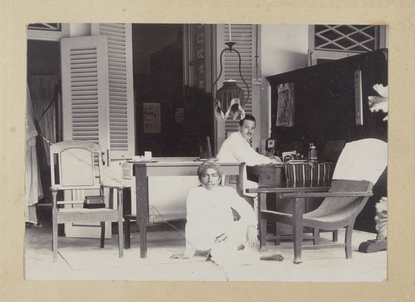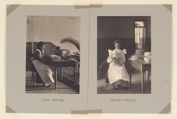 Curator: This photograph by Frances Benjamin Johnston captures a young woman engaged in lace making at the Hampton Normal and Agricultural Institute. It projects a quiet, almost melancholic air, doesn’t it? Editor: It does. The subdued greyscale and the woman’s focused gaze create a contemplative mood. The composition, with its strong diagonals formed by the floorboards, draws the eye directly to her. Curator: Indeed. Lace making, traditionally associated with European aristocracy, here symbolizes vocational training offered to African Americans post-Civil War. There’s a complex history embedded in this image. Editor: The lace itself could be seen as a symbol, too. The intricate patterns echoing ideas of cultural assimilation, of weaving together different strands of identity. Curator: Precisely. It’s fascinating how Johnston uses this visual vocabulary to convey themes of education, labor, and cultural identity. Editor: Absolutely, the photograph's formal elements work to underscore the social and historical context in a way that is both subtle and powerful. It’s a testament to the complexity of representation. Curator: Yes, a potent reminder of the layered meanings within a seemingly simple image. Editor: I agree. It has certainly offered some food for thought.